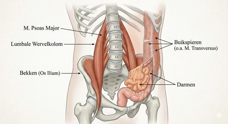 De psoas ligt extreem diep in je buik verstopt. De psoas hecht aan de lendenwervels (L1-L5) en de twaalfde borstwervel (T12), loopt diep door het bekken, komt daar samen met de iliacus en hecht zich vervolgens aan het bovenbeen. De psoas loopt dus van je rugzijde, achter je buikvlies, je darmen en onder drie dikke lagen buikspieren (en vet) langs. Om via de voorkant de psoas te benaderen is dus nagenoeg onmogelijk.